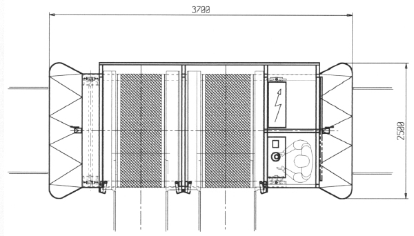 La macchina è stata ideata per caricare, scaricare e trasportare carrelli con scaffalature di piastre refrattarie contenenti tazze. L’operatore seleziona il numero del binario quindi, in automatico, agendo sull’apposito joystick trasla in direzione del binario selezionato. Giunto in prossimità del binario la macchina effettua automaticamente le operazioni di sbarco/imbarco carrelli. E’